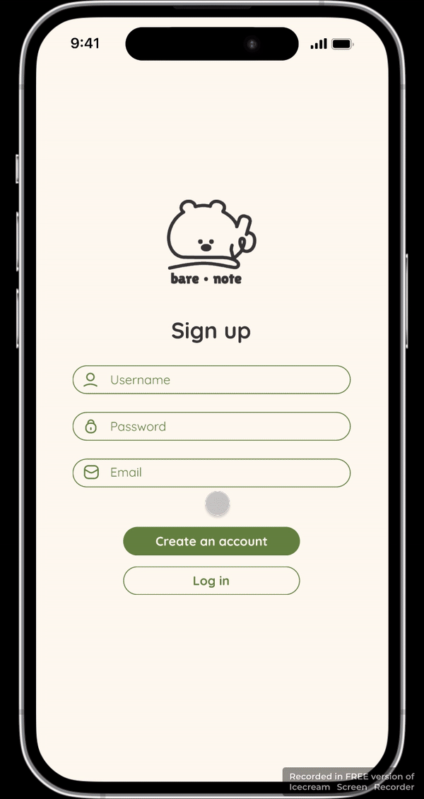 We looked for combinations using wordplay or puns to make the app feel more relevant at first impression. After many candidates were thrown out the window, we decided on “Barenote,” which signifies starting with a fresh blank page when creating ideas. The “bare” word is a wordplay on “bear” that adapted into our cute little mascot character to add to the app immersion.